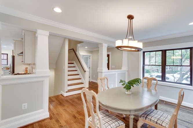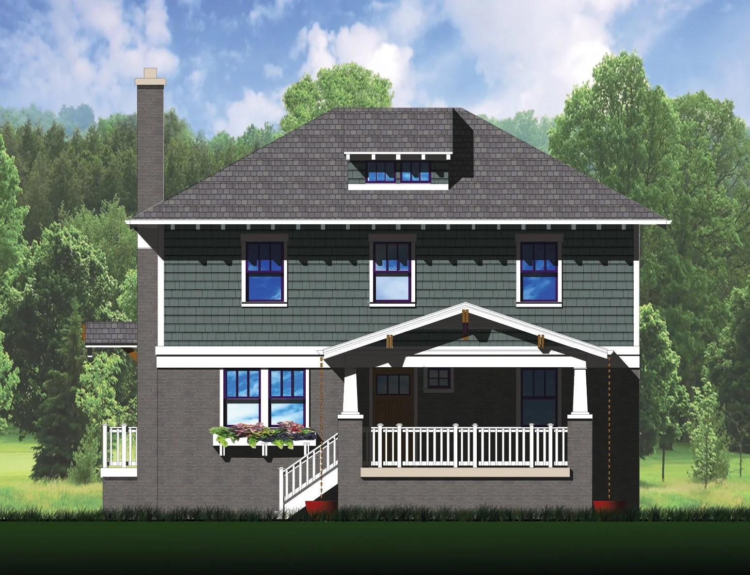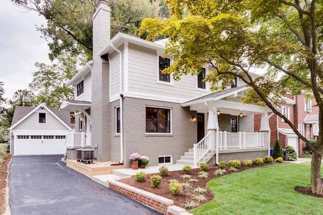 Exterior enhancements introduce defining elements of the Craftsman vernacular, including deep roof overhangs with exposed rafter tails, tapered columns set on stone piers, shake siding accents, and a welcoming covered front porch. A palette of natural materials—wood and brick—was selected to complement the original masonry, reinforcing a sense of authenticity and continuity within the surrounding context.