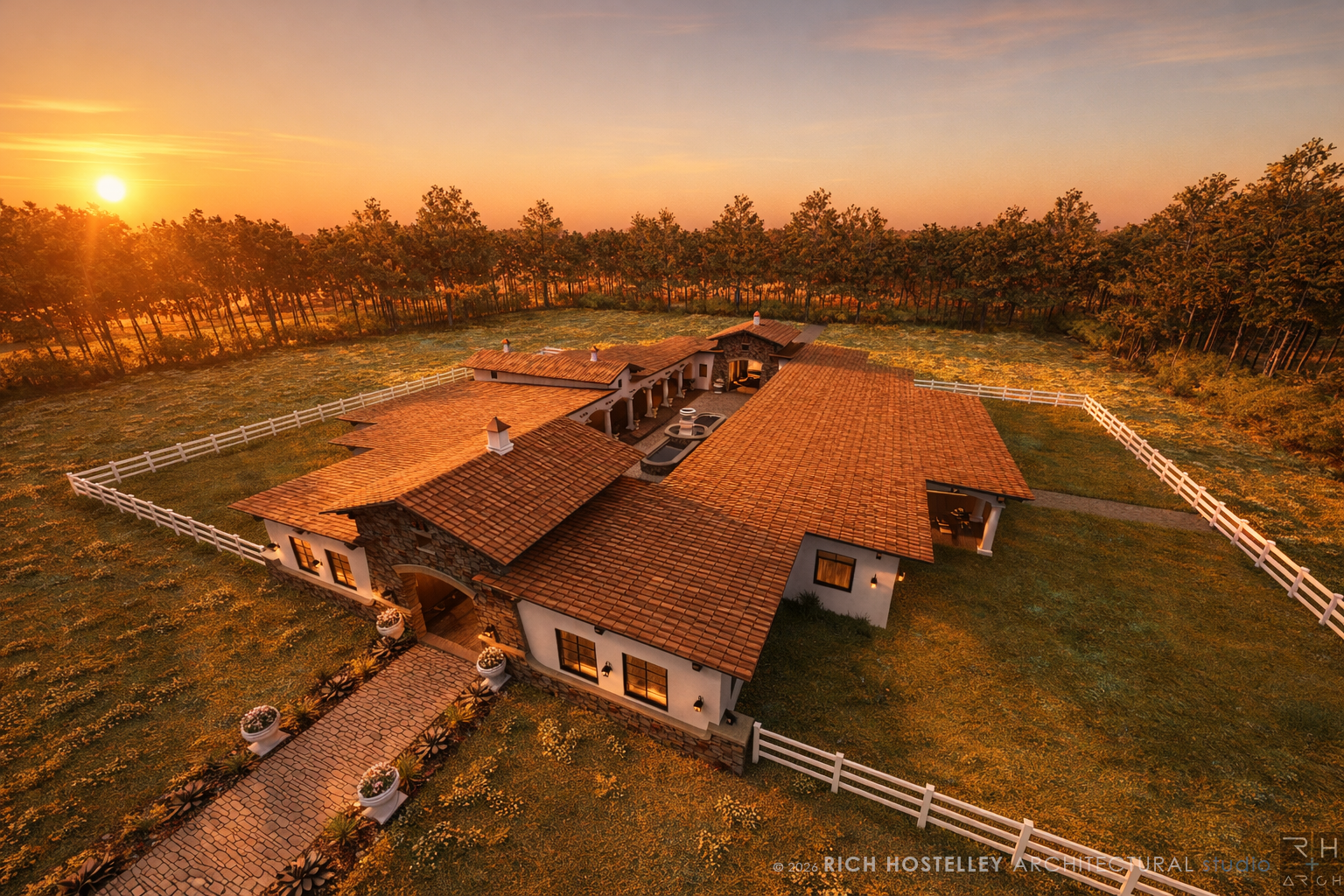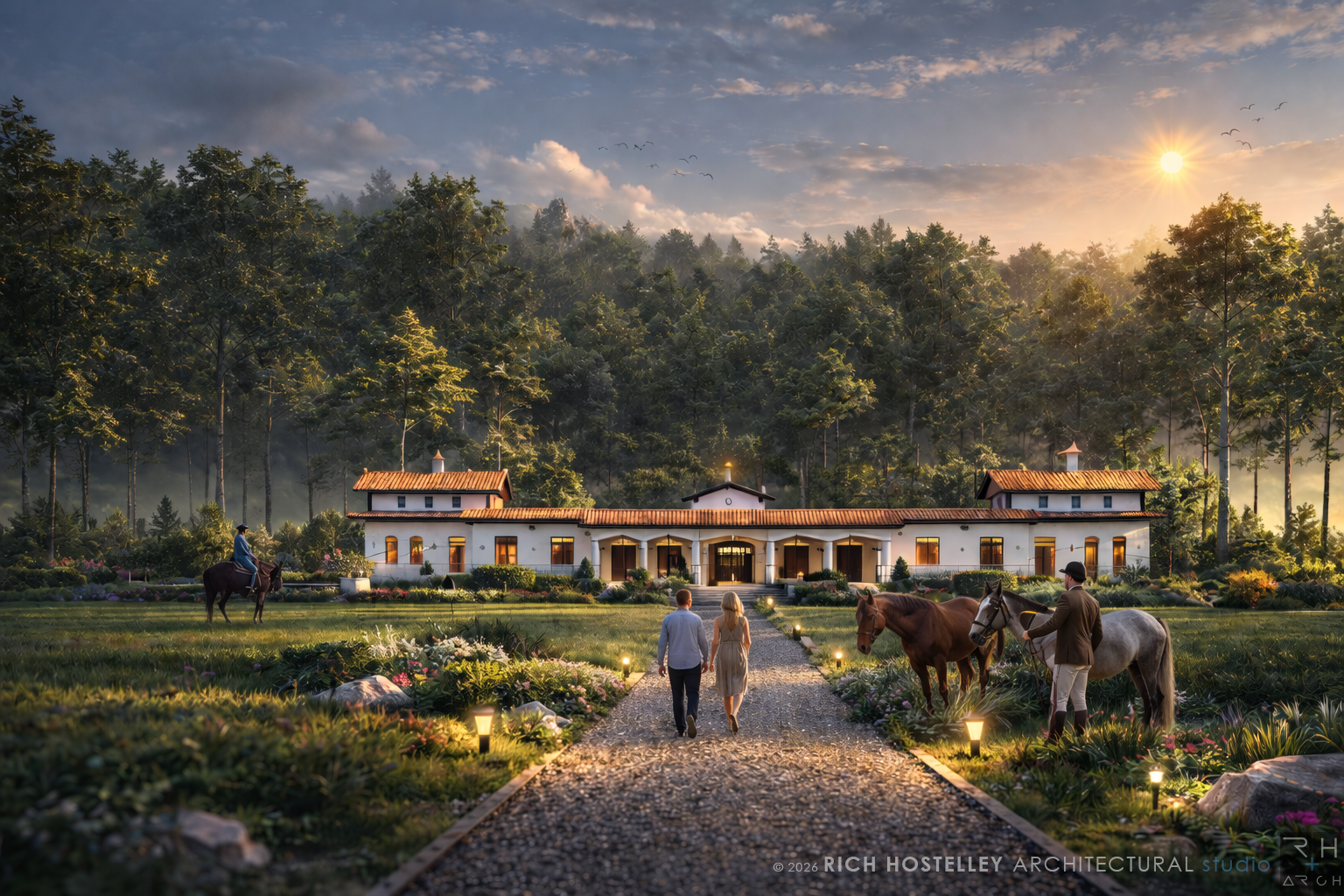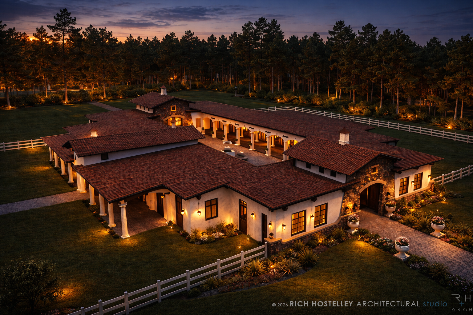 Architecturally, the project draws from Mediterranean and Spanish influences, incorporating tile roofing, stucco finishes, and stone elements to create a timeless, regionally appropriate aesthetic.