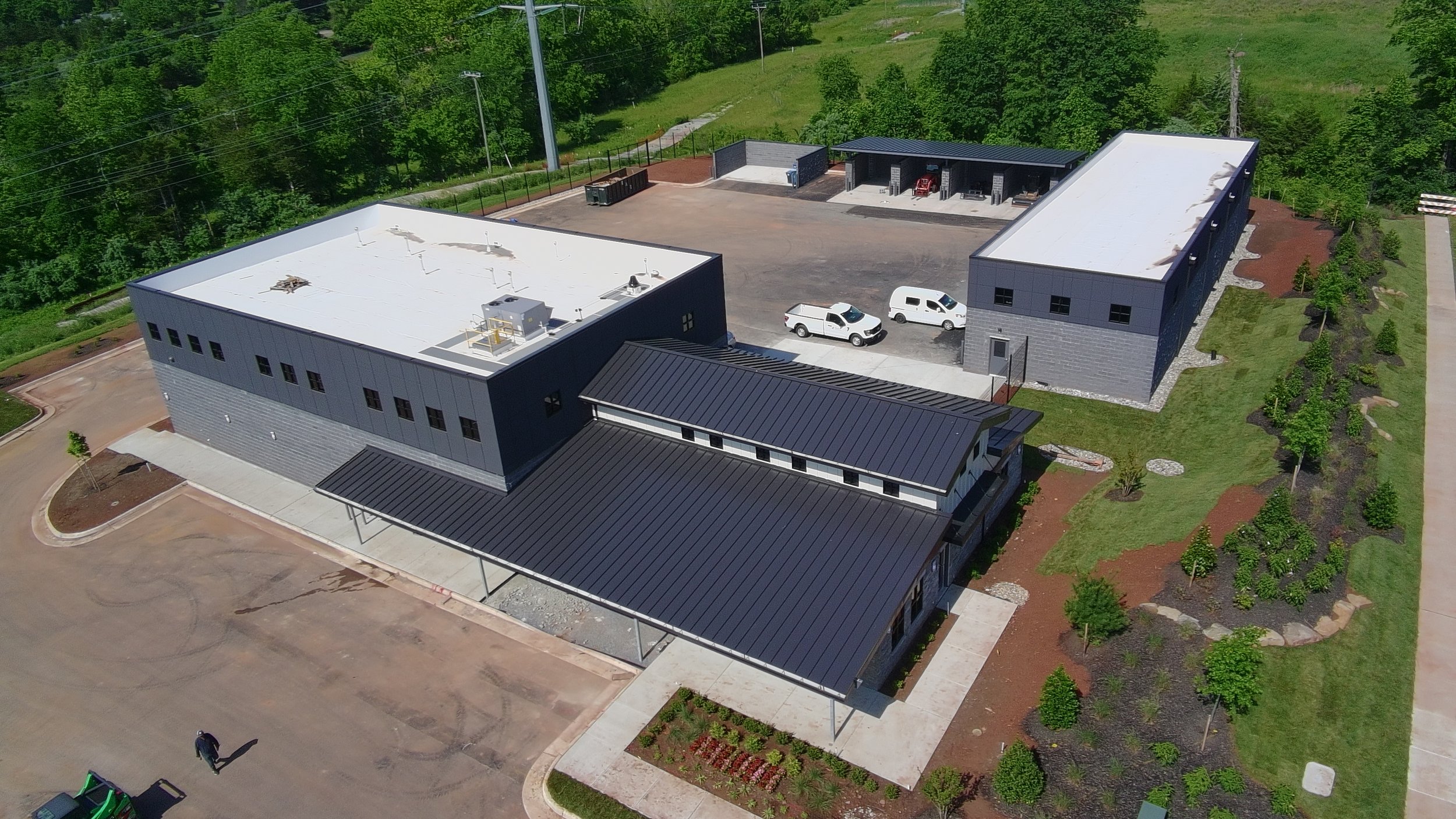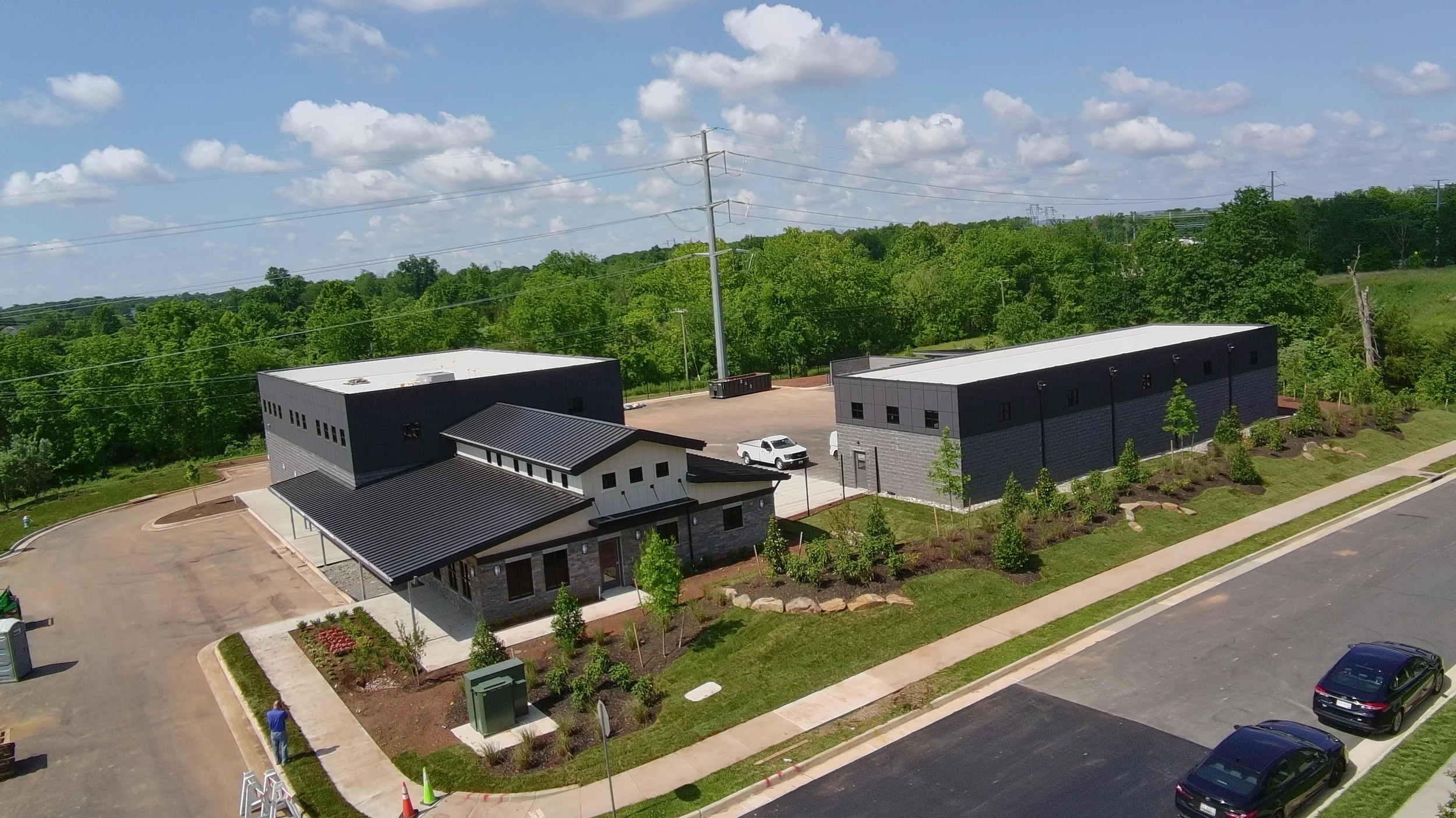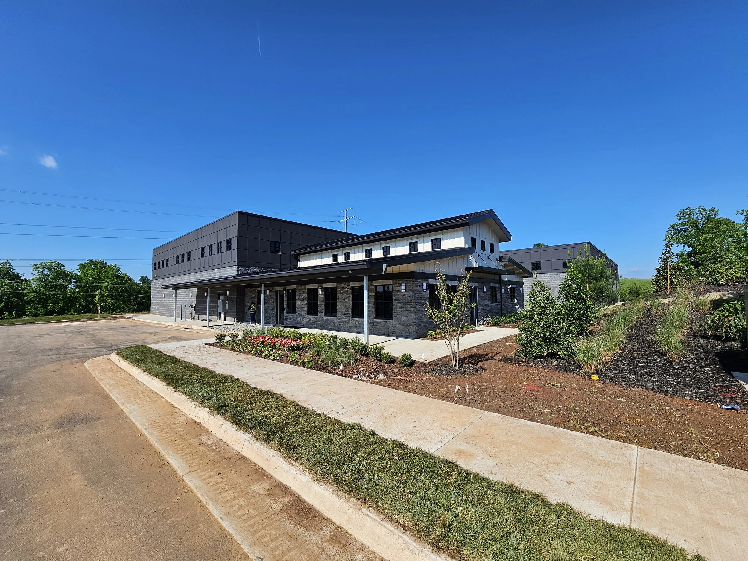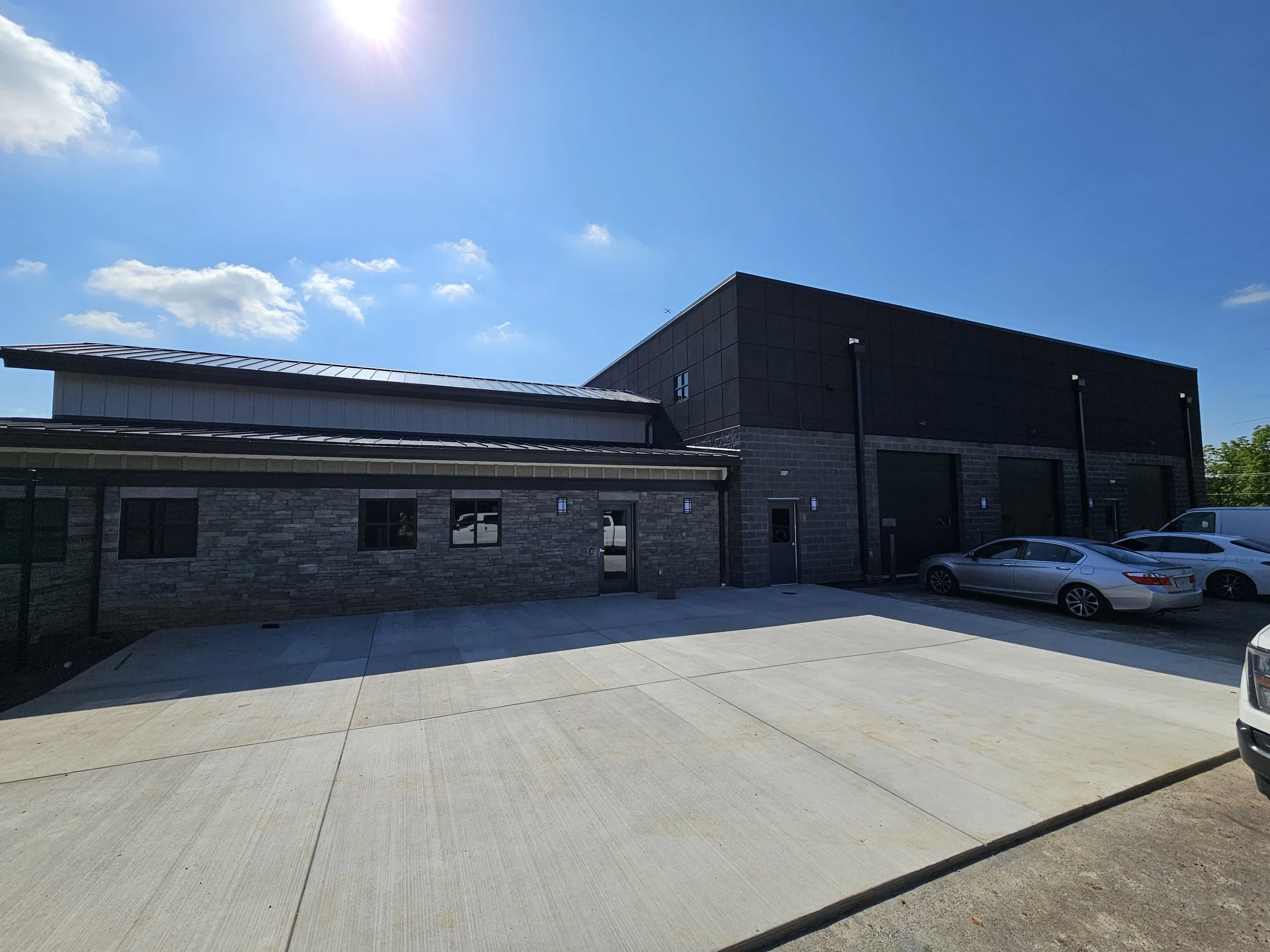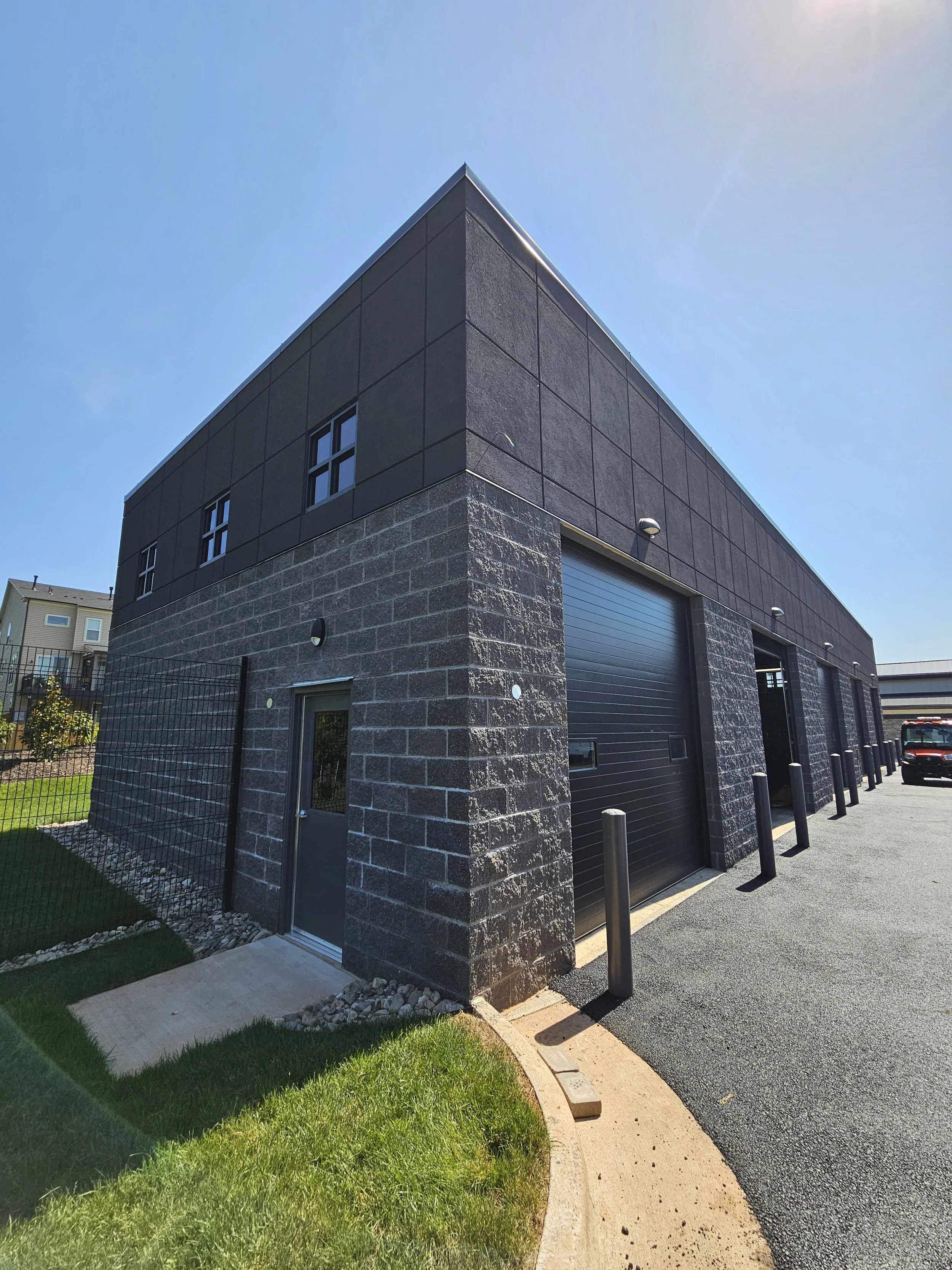 A unifying design strategy connects all three buildings. The exterior cladding of the garage mirrors the aesthetic language of the Main Office and Maintenance Building, reinforcing a strong visual identity and creating a harmonious architectural dialogue across the site. The use of complementary materials, color palettes, and clean lines establishes a cohesive and professional presence while maintaining functionality and ease of maintenance.