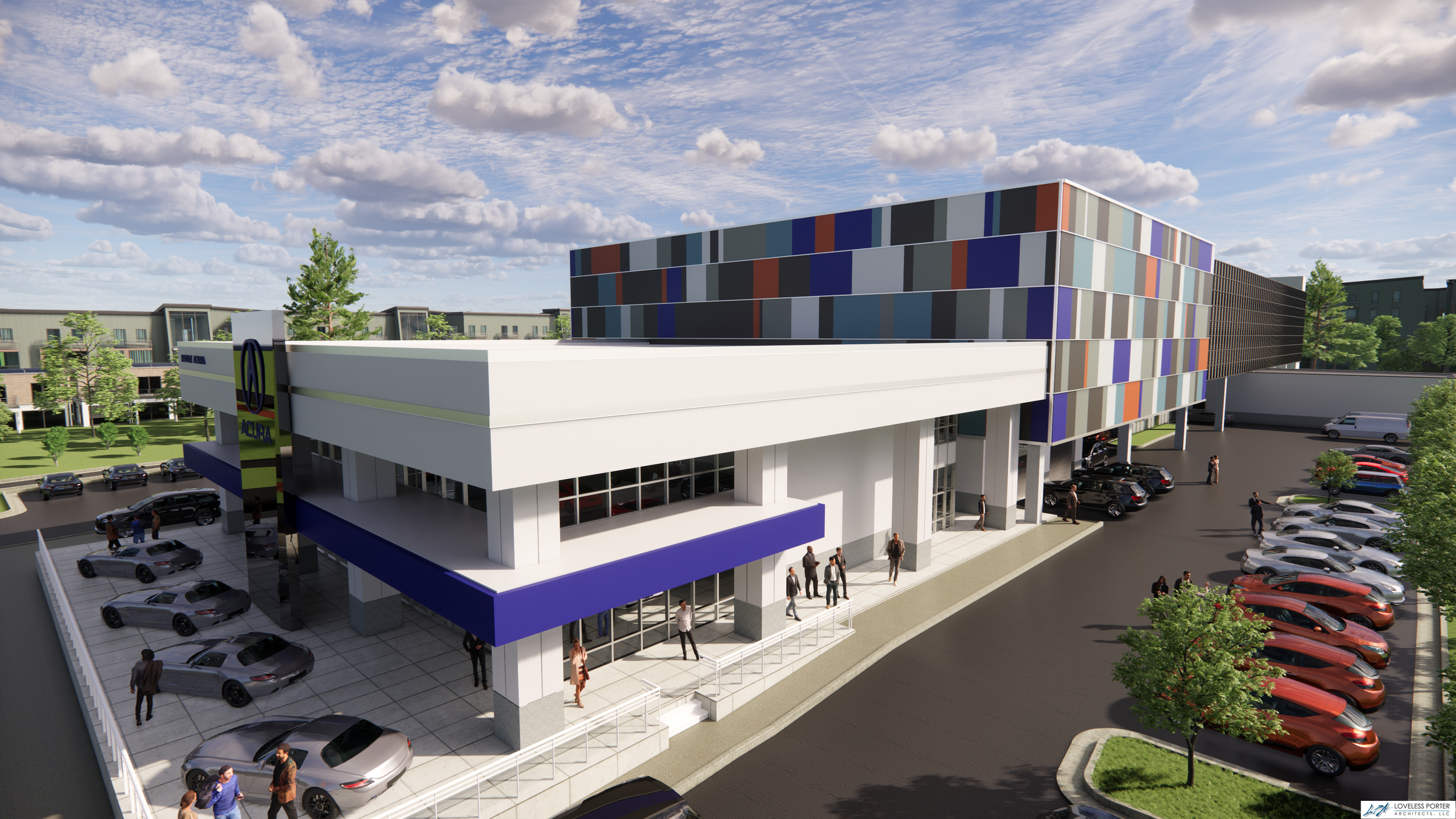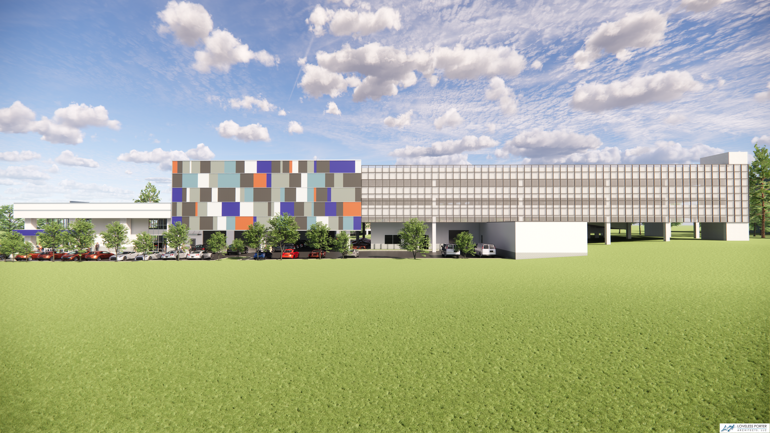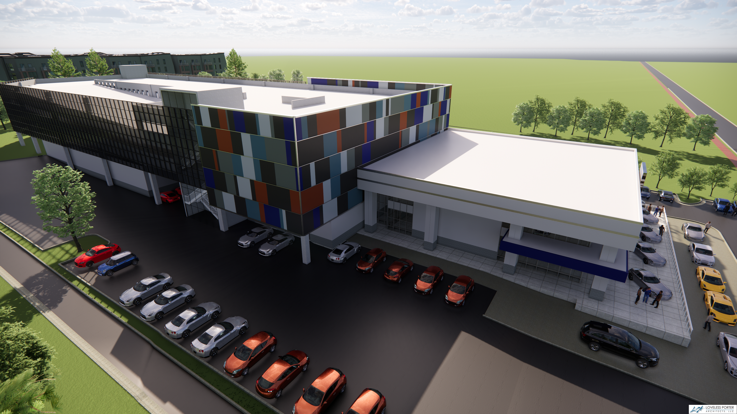 A central design challenge involved addressing zoning requirements for screening the parking structure. This was resolved through the introduction of a custom façade system that conceals the utilitarian nature of the garage while contributing to the overall architectural identity of the facility. The façade is carefully articulated to balance scale, rhythm, and materiality—transforming the structure into a cohesive and visually integrated component of the dealership campus.