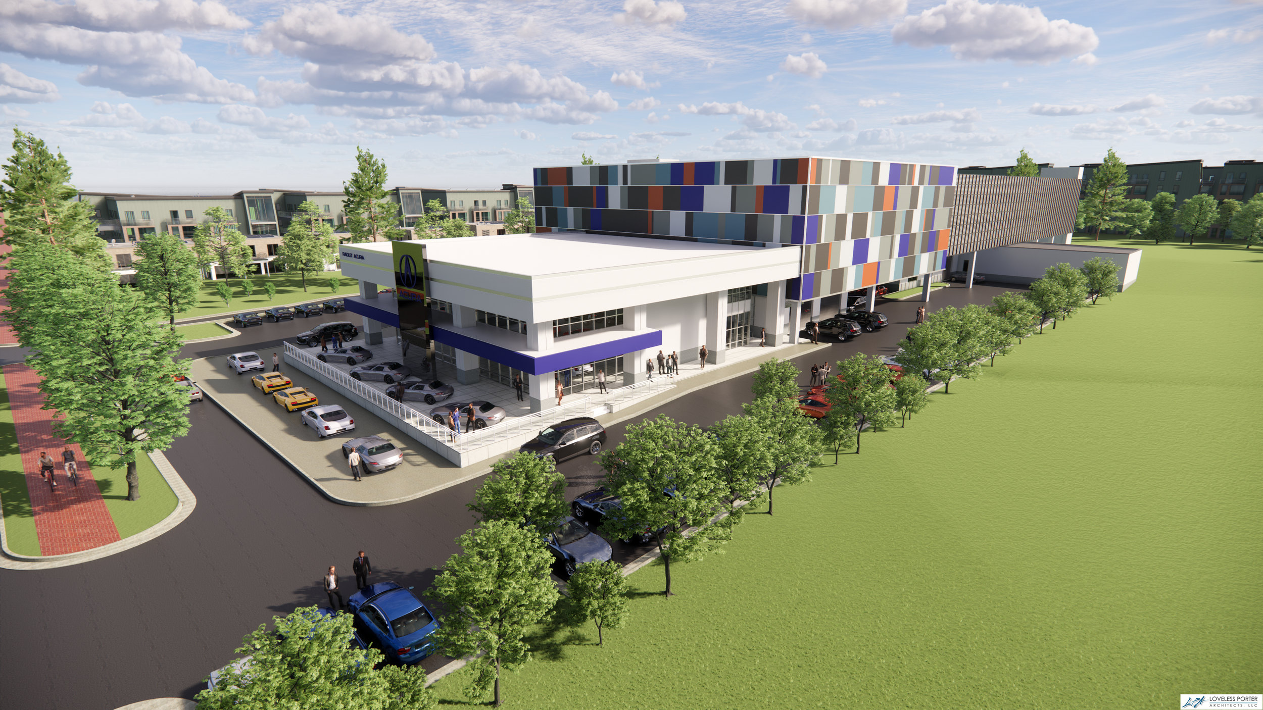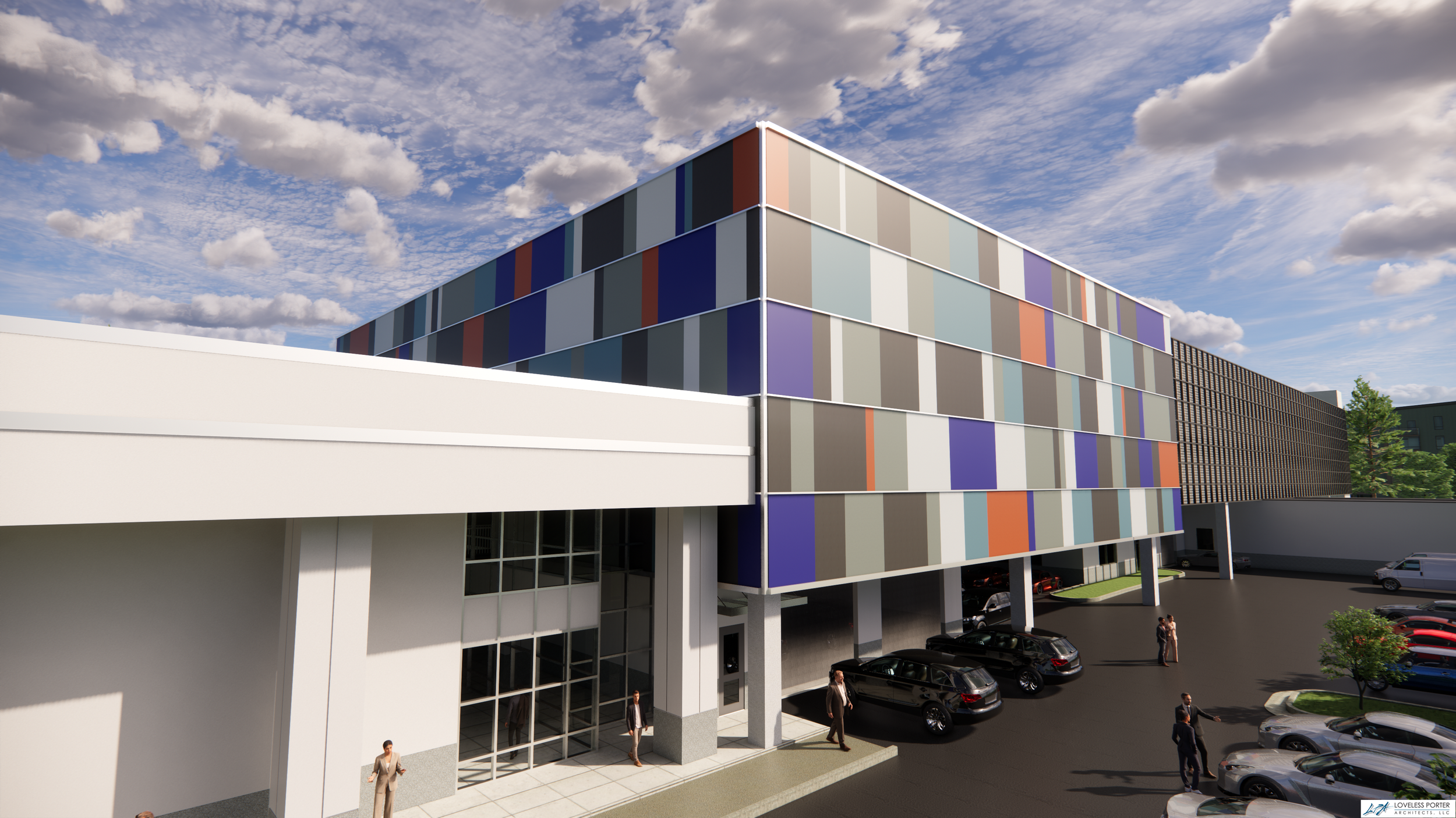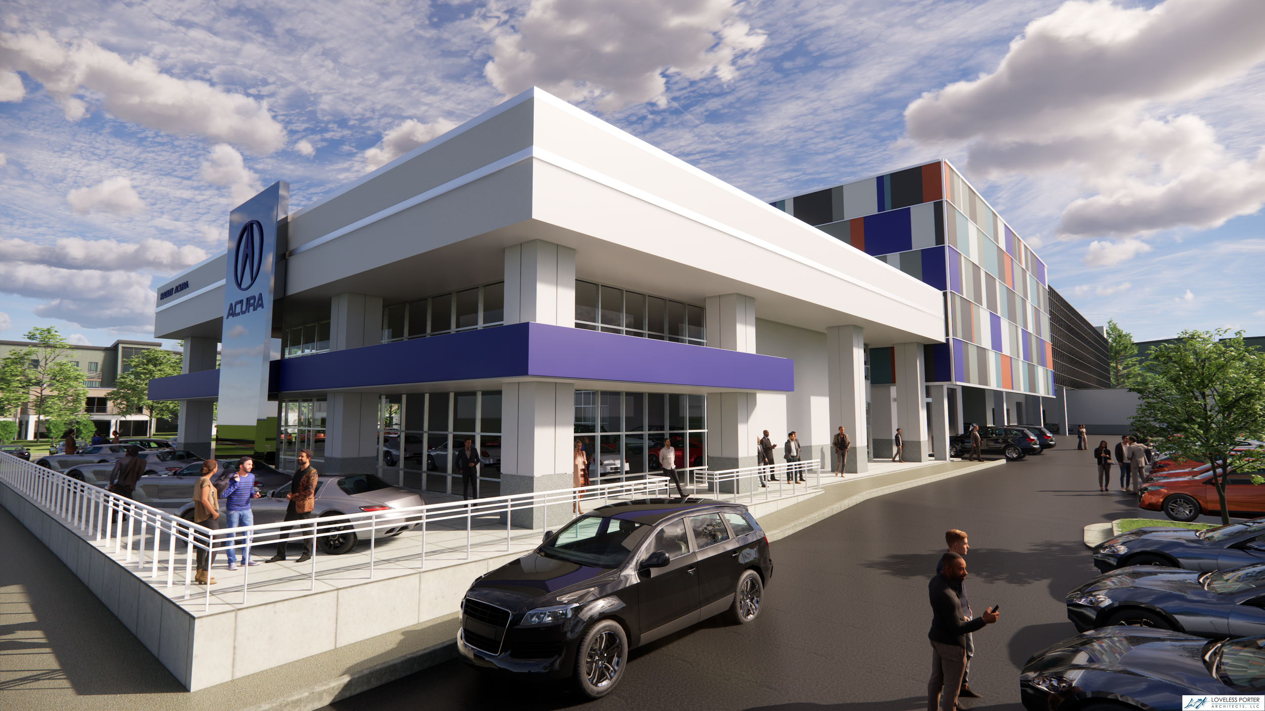 A central design challenge involved addressing zoning requirements for screening the parking structure. This was resolved through the introduction of a custom façade system that conceals the utilitarian nature of the garage while contributing to the overall architectural identity of the facility. The façade is carefully articulated to balance scale, rhythm, and materiality—transforming the structure into a cohesive and visually integrated component of the dealership campus.